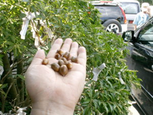 | 風の舎前にどんぐりの木があり、風が吹くと一気に落ちてきて車にあたると小石があたっているような音がします。運転手のみなさんは「何!」という顔をされてました。(^o^;) | 館横に赤い可愛い実がなっている木を見つけました。たまには上も向いてみるものですね♪ | ||||||