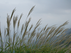 | 風に揺れているススキです。もう秋ですね…。 後ろに見えている阿蘇外輪山、わかりますか? |