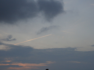 夕暮れの空に気持ち良さそうに飛んでいる飛行機発見!! いいな〜。青春の1ページみたいでしょ? 田舎の空はでっかいですよ! |
